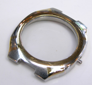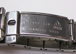 ステンレス無垢バンドに三つ折れバックルで。バックル部分の文字が何か変では?