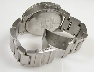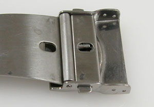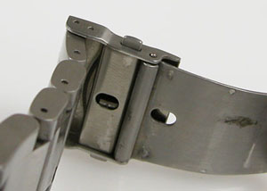 ステンレス無垢バンドに両開きバックル。微調整位置をチェックします。
