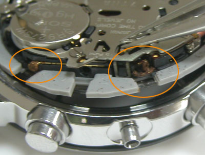 この粉がムーブメントに回っていて動きません。ところがクロノグラフは動きます。