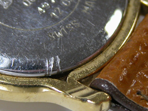 これが裏蓋記載。おや?開けた跡が・・・こんな所に開け口は無い。