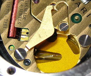ここでやっとひらめきましたね、このボタン。竜頭が無いわけですからこのボタンを押してモータードライブで針を回す訳です。ベルトはピッカピカ!