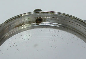ムーブメント取り出しで、錆びた粉がケース内に散ります。