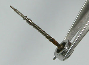 ただ巻真の根本が錆びて摩耗して細くなっています。交換が必用ですがパーツの入手は不可。かといって巻真のみ交換としても捻ったら折れるでしょう。このままそっと使うしかありませんが、乱暴に引くと折れます。そうなると竜頭ごとの交換ですから取扱店しか無理ですし費用も20.000円くらいは覚悟しないと。