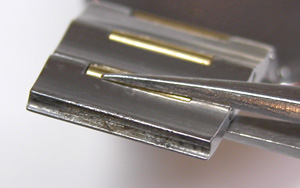 ベルト調整出来る部分では無い箇所で、ピンを通す穴の空いた部分で溶接された部分が外れていますから。これは修理は不可。ベルトごと交換も考えますが・・・ラグ部ピンとケースの隙間が1mmもない状況では革ベルトさえ取り付け不可能。いくら専用バンドとはゆえ、この隙間に入るメタルバンドを作ったなと驚きました。