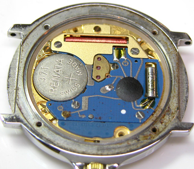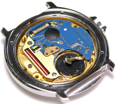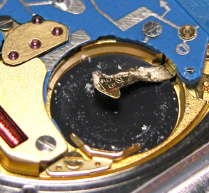 拭き取るのみで問題なく動きました。普通の時計屋ならこの電池を見せて「要OH」ですね。新しい電池を入れて動作確認。