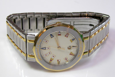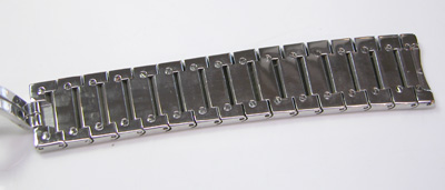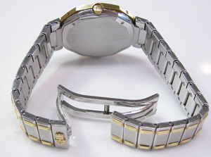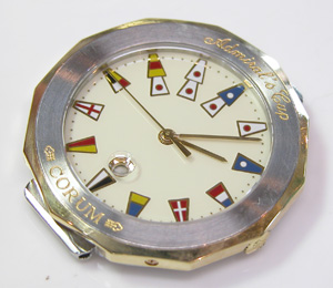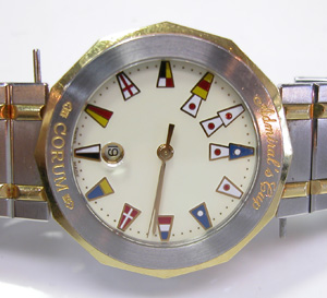ステンレス無垢バンドに両開き無垢バックル。バックルにも竜頭と同じコルムのマークが施されています。