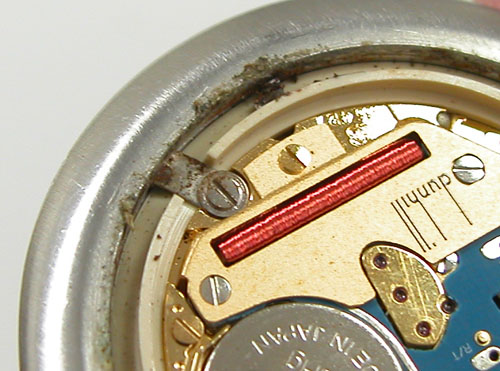 パッキンが効いてはいたがケースの腐食が進んで隙間が出来、浸水した形跡。