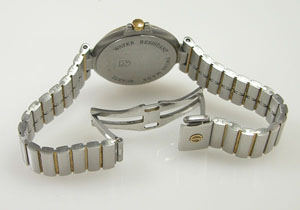 ステンレス無垢バンドに三つ折れプッシュバックルは両開きバックル。