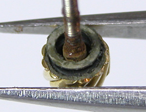 オリジナル竜頭ですが角が錆びています。この程度は交換しなくても大丈夫。竜頭の裏側チェックしますと何やらリングが。