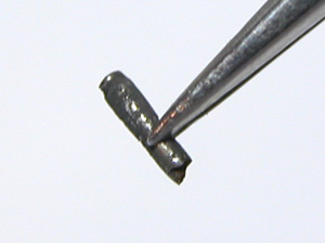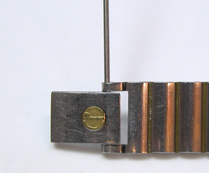さてバックルですが、専用のピンなどはありませんから代用品で修理。写真では1本のピンを突き通している様に見えますが、金具の中央で穴は貫通せずにセパレートされています。よって両サイドから2本のピンを作ります。キツイ目の棒を打ち込んで頭を削ってけがをしなようにします。ここまでやったからと言っても保証も出来ないので500円〜1000円頂くのがやっとですが。