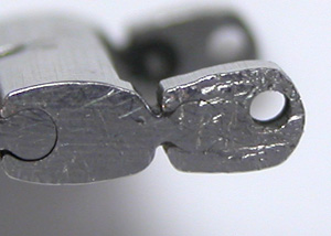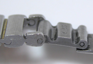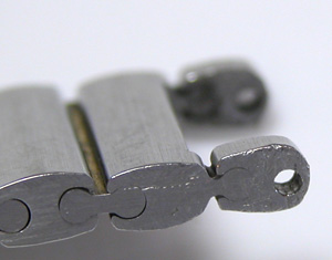 この様に両サイドに突き出た突起で留まっていますが片方が折れています。こういった箇所は普通は修理不可で、直すとすれば”バックルと端のコマのセットで交換”とかになります。この突起で留まっています。何故修理は不可になるかと言えば修理しても、その後どこまで耐えられるか分かりません。直す限りは手間も掛かりますし手数料も頂きます。でも。手数料は頂いても、また壊れたら保証は無し。つまり”最初から受け付けない方が賢明”となります。