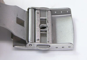 ステンレス板巻きバンドに三つ折れプッシュバックルはダブルロック。