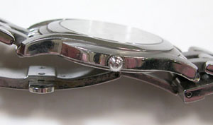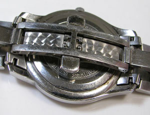 ステンレス無垢バンドに両開きバックル。