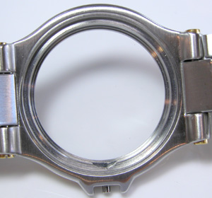 ステンレス無垢バンドに両開き無垢バックル。裏蓋は”はめ込みタイプ”