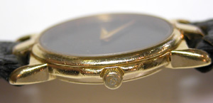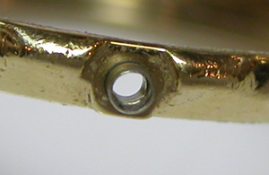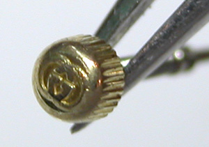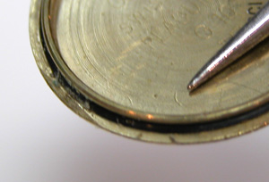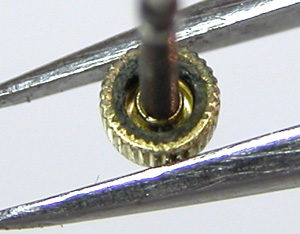 竜頭の裏側チェック。文字盤を取り出すためにはベゼルも外します。裏蓋と同じはめ込みですからここから開けます。