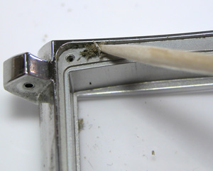 やはりこういった所にはホコリが溜まりますね・・・裏蓋の構造上仕方がないですか。軽く楊枝で掃除しておきましょう。竜頭の洗浄は完了。