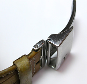 革ベルトとのジョンとはバネ棒ではなくてネジ留め。さすがブランドウォッチ。ハイ、電池交換メンテナンス&バンド交換完了です。