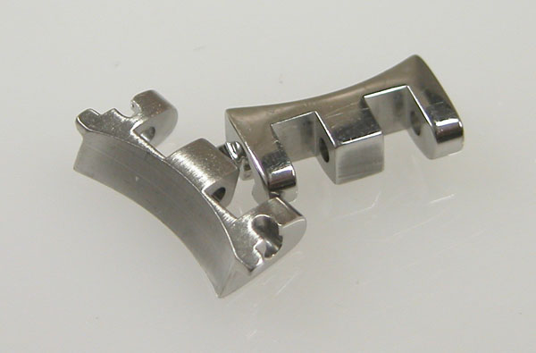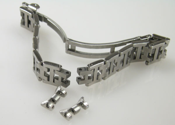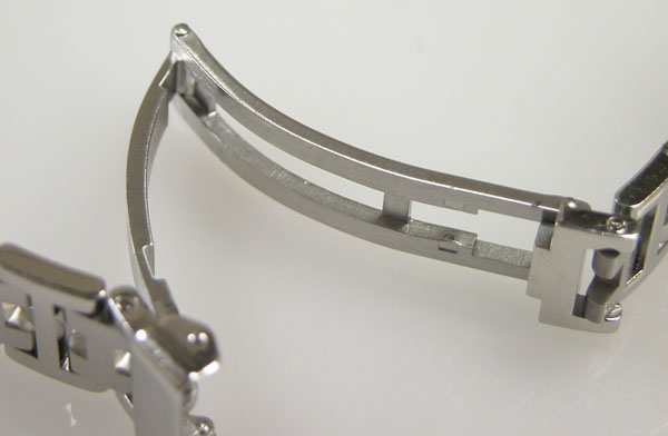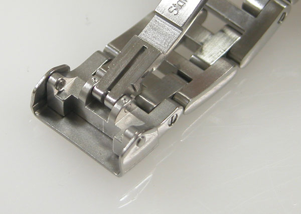 ステンレス無垢バンドに三つ折れバックル。
