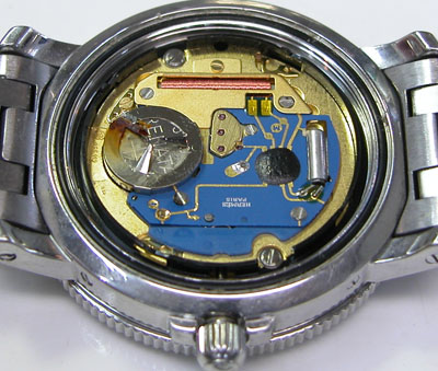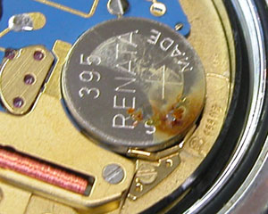 ムーブメント拡大ですが電池と電池押さえが茶色く錆びています。