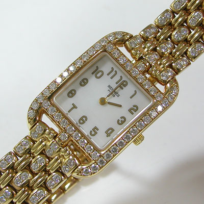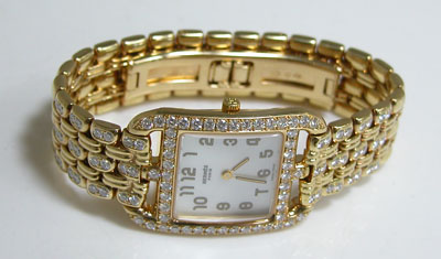 2012年4月3日お預かりのHERMES K18 Diamonds電池交換メンテナンスです。18金ですからズッシリ重い。私ら田舎の時計屋にとっては、いったい幾らの腕時計なのだ?というレベル。「18金にダイヤ巻き」つまりはサイト記載している「高額品はご遠慮願います。ネットでのやり取りにはリスクが高すぎます」と書いてある正にその腕時計。一限さんなら断りますが常連の方ですしNC・NRはご理解頂いておられるので預かり。かといってこのクラス物を「ガラスが壊れました。ゴメンサイ」という訳にもいかず、そうなったら何十万は掛かるでしょう。こういった電池交換は何処でも断られるのですが。代金10.000円頂いても何かあれば数十万吹っ飛びますから仕方がないでしょう。