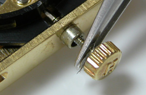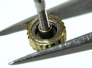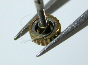 肌に密着はしなくても袖には触れますから、繊維を巻き込んでいた様です。これは吹き飛ばすのみで何ら問題はありません。これが竜頭パイプを通ってムーブメントに回れば厄介ですから竜頭を抜いてみてラッキーでした。竜頭パイプを掃除します。