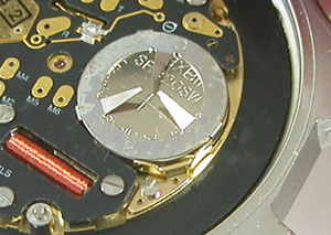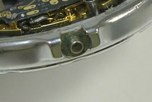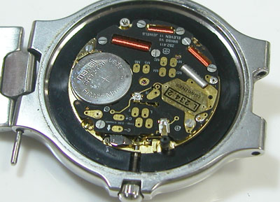 綺麗になったケースにムーブメントを戻しますが電池押さえのリングと言い、各部の銀色のネジの頭に湿気た跡がみえますから、おそらくはガラスも曇ったかと。あまり防水機能は期待してはいけない腕時計の様です。実際、裏蓋閉めも指のみで簡単に閉まりますから。