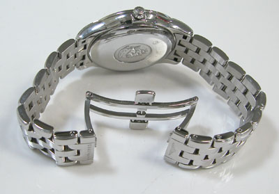 ステンレス無垢バンドに両開きバックル。