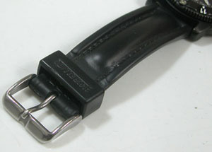 ベルトは交換されておりますが元はメタルでしょう。この交換された「革ベルト?」見掛けはカーフ型押しですが裏側からみたらウレタン。実にこの時計に似合っております。それにウレタンですからダイバーウォッチにも最適。