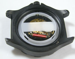 裏蓋を開けるとスペーサーがムーブメントを覆っています。このスペーサーがガタガタ動きますね・・・。そしてスペーサーが動いてもムーブメントが動かないと言うことはムーブとスペーサーにも隙間があると言う事ですか。これは後で修整します。