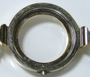 パッキンがケース側について出て来ました。ケースの腐蝕が目立ちますがパッキンよりも内側は綺麗です。裏蓋側にも腐蝕が見られます。