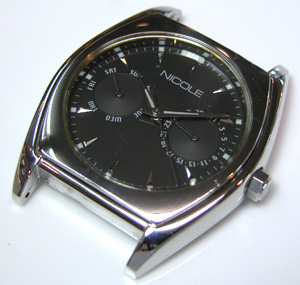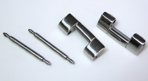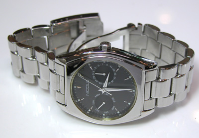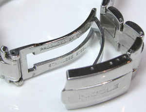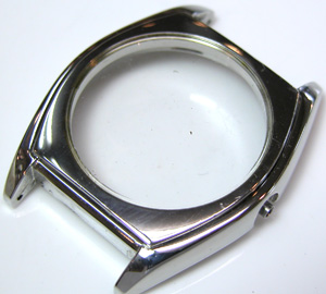 カーブガラスが綺麗な腕時計。また”バフ掛け”も依頼ですがつや消し部分があるとバフ掛けはしにくい訳ですが、これはケースもバンドもミラー状なのと、そこそこの値段の腕時計ですからメッキも最低限の厚みはあるでしょう。思い切ってバフ掛けしてみましょう。ベルトはステンレス無垢バンドに三つ折れバックル。
