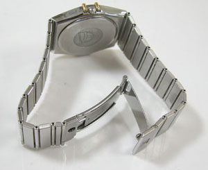 ステンレス無垢バンドに三つ折れプッシュバックル。