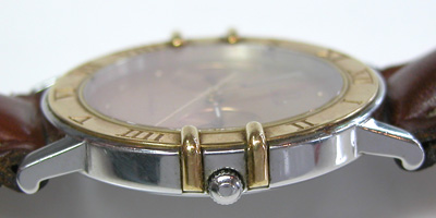 コンステ独特の形状で竜頭にはΩマークがキラリ。