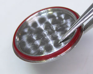 綺麗になったケースにムーブメントを戻して電池格納部をチェックしますがマイナス端子に曇りが?