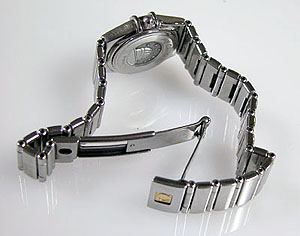 ステンレス無垢バンドに三つ折れプッシュバックル。