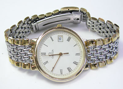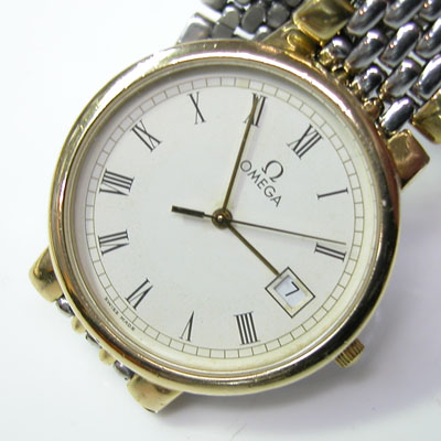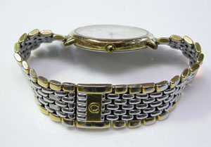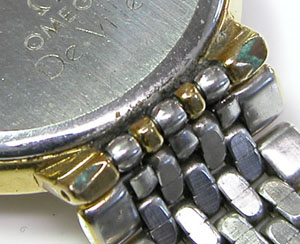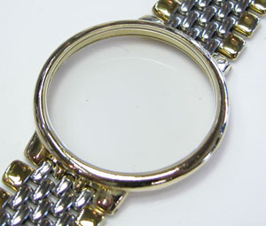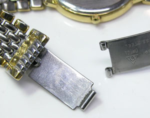 ステンレス無垢バンドに三つ折れプッシュバックルですが丁番部分が外れている。これは修理不可、普通はバックル交換しか対応は出来ませんが何とかやってみます。