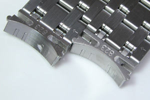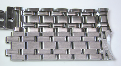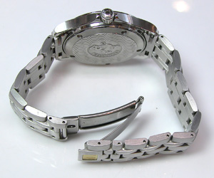 ステンレス無垢バンドに三つ折れバックル。ベルト調整の要領でベルトを開きますが、Cリング式です。