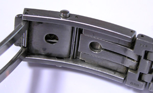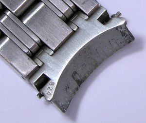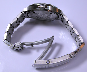 もちろんステンレス無垢バンドに無垢のプッシュバックル 。バックルにもOMEGA Seamaster professional の記載があります。