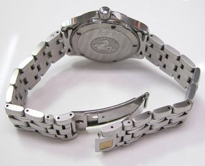 ステンレス無垢バンドに三つ折れプッシュバックル。