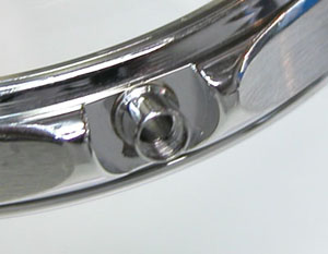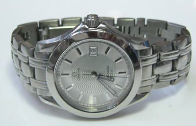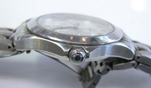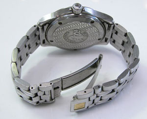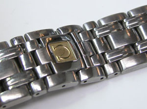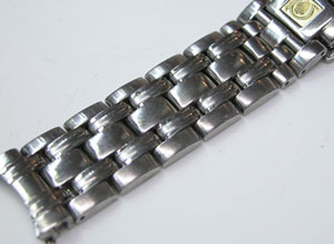 ステンレス無垢バンドに三つ折れプッシュバックル。