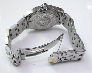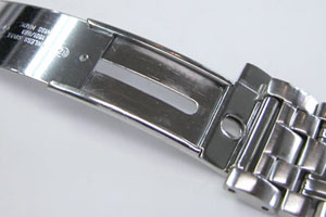 ステンレス無垢バンドに三つ折れプッシュバックル。