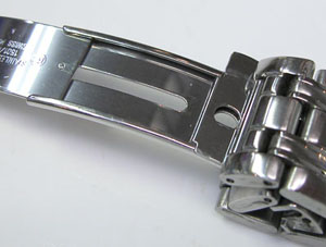 ステンレス無垢バンドに三つ折れプッシュバックル。
