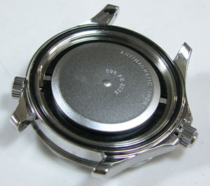 裏蓋を開けると耐磁プレートがムーブメントを覆っています。