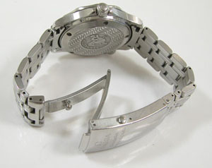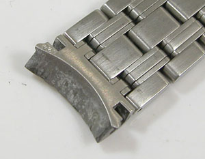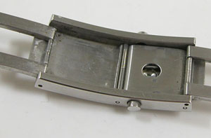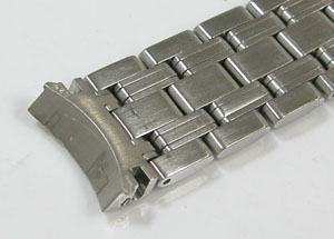ステンレス無垢バンドに三つ折れプッシュバックル。