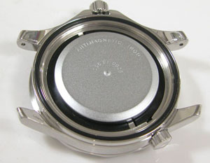 裏蓋を開けると耐磁プレートがムーブメントを覆っています。