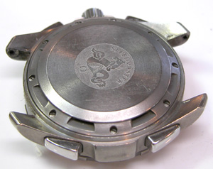 裏蓋ネジ留め。如何にも重厚そうなボディーですが日常生活防水。写真右が裏蓋ですが。外すと薄い耐磁プレートが見えます。その耐磁プレートを。