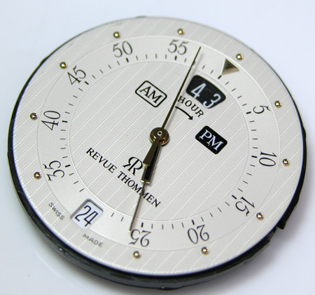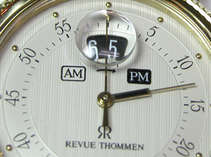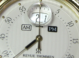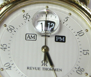 さてこの腕時計、どうやって時間を読むのか?サイクロップレンズ箇所ですが、数字が左から右に回転しています。よって写真では「黒→白」に切り替わろうとしています。これで「午前1時38分」ですか。