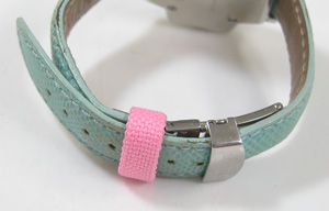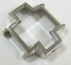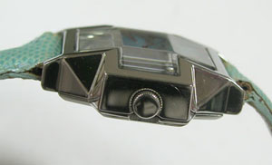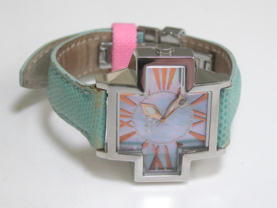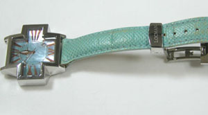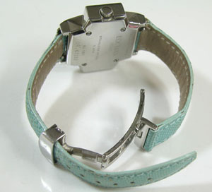 強烈なクロスのカットガラスは印象的。バックルは両開きバックル。