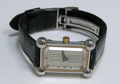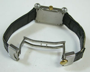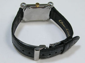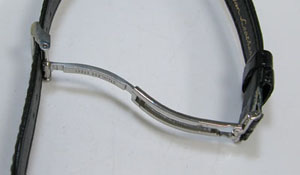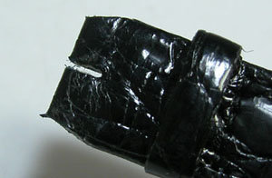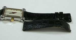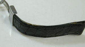ベルトを取り付け電池交換メンテナンス完了はしません。革ベルト交換ですが勿論「専用バンド」は入手不可。そこで既製品ですが、新品のワニ革を取付ます。そしてバックルですが上部の長さは古いベルトと同じですからそのまま流用。尾錠を外してバックルに取り付けようとしますが厚みが。純正は1枚革ですが既製は”針合わせ”なので厚い。