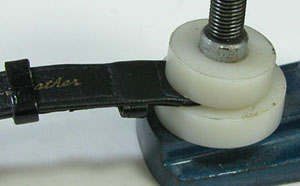 そこでプレス器で押さえてみても入らない。これ以上薄い既製バンドはありませんから諦めですが、こちら新品のバンドをお釈迦にしてしまったので困り果て。